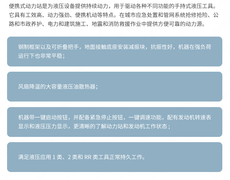適用于路面搶修、道路施工、市政維護(hù)、保養(yǎng)、園林等工作場景 ;.設(shè)備安裝便捷,搬運(yùn)簡便,適應(yīng)性強(qiáng),可輕松解決破碎、切削、分裂、打樁、壓實(shí)等施工項(xiàng)目。