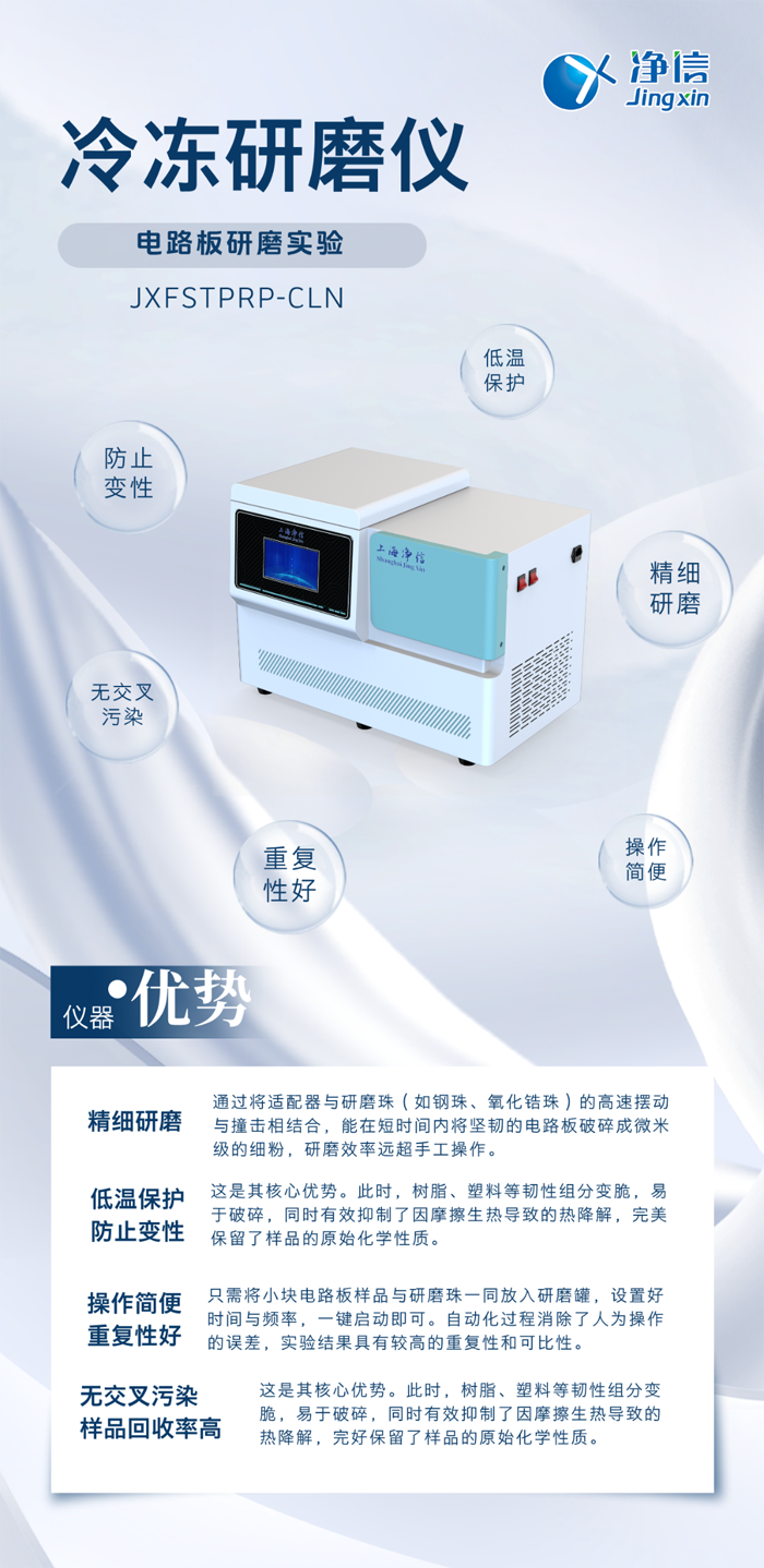 凈信冷凍研磨儀憑借其低溫、避免污染的研磨特性,成功解決了電路板這類復(fù)雜復(fù)合材料的前處理難題。它不僅是提升RoHS檢測、材料成分分析等數(shù)據(jù)準確性的“得力助手”,也是在電子廢棄物資源回收領(lǐng)域進行物料分析的“神兵利器”。選擇凈信冷凍研磨儀,意味著選擇了一條通往更可靠實驗結(jié)果的捷徑,為您的科研與質(zhì)控工作提供了強有力的技術(shù)保障。