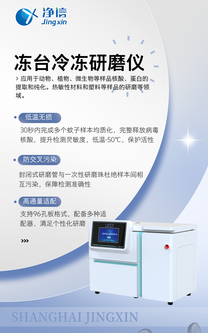 凈信凍臺冷凍研磨儀以標準化、自動化的研磨方案,助力疾控中心構(gòu)建更快速的蚊媒病毒響應(yīng)體系。它不僅解放了實驗室人力,更通過提升樣本處理質(zhì)量,為流行病學(xué)研判提供可靠技術(shù)支撐,默默守護著公共衛(wèi)生安全的第一道防線。