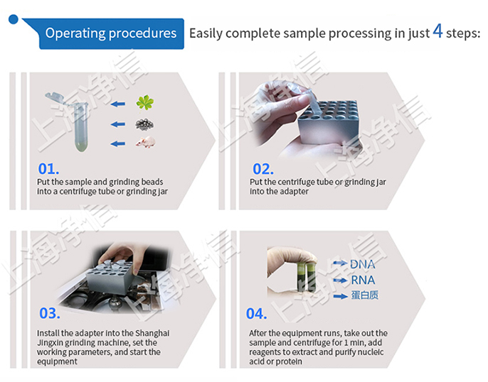 實(shí)驗(yàn)步驟 1.準(zhǔn)備好不銹鋼研磨管,將研磨管和研磨球清洗干凈,并滅菌滅酶; 2.將需要研磨的樣品剪成小塊,放入準(zhǔn)備好的研磨管中,加入一顆研磨珠。蓋好蓋子; 3.將裝有組織樣品的研磨管放入液氮中,冷凍至不沸騰為止; 4.取出已經(jīng)冷凍的適配器,把冷凍好的不銹鋼研磨管取出插入適配器中; 5.將適配器裝入凈信研磨儀中; 6.設(shè)定好參數(shù),啟動(dòng)儀器至研磨程序結(jié)束,可得到粉末狀樣品。