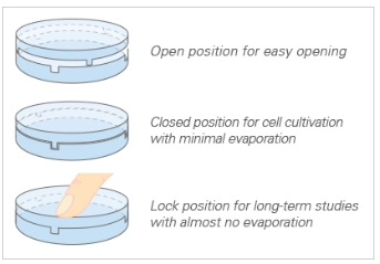 All ibidi μ-Dishes are equipped with the special lid-locking feature. The locking position minimizes evaporation, and thereby provides excellent conditions for long-term studies in a non-humidified environment. Gas exchange (carbon dioxide or oxygen) during cell culture is maintained thanks to the gas-permeable plastic material of the dish.