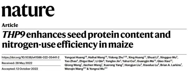北京時間2022年11月17日,中國科學(xué)院分子植物科學(xué)****中心巫永睿研究團(tuán)隊(duì)與上海師范大學(xué)王文琴研究團(tuán)隊(duì)合作在Nature上發(fā)表了題為 “THP9 enhances seed protein content and nitrogen-use efficiency in maize”的研究論文。