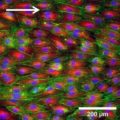 HUVEC在I型膠原蛋白(2 mg / ml)上以10 dyn /cm2的流量培養(yǎng)5天后的熒光顯微鏡檢查 。
