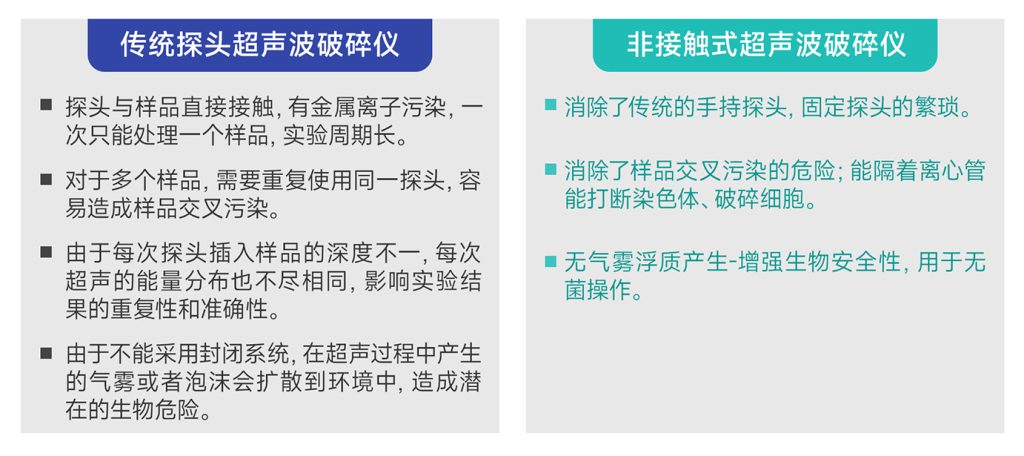 采用超聲波磁致伸縮的原理,把超聲波波形聚焦在液體中,使超聲波能量有質(zhì)的轉(zhuǎn)變。傳統(tǒng)的探頭超聲波破碎儀,探頭與樣品直接接觸,一次只能處理一個樣品,實(shí)驗(yàn)周期長;對于多個樣品,需要重復(fù)使用同一探頭,容易造成樣品交叉污染。由于每次探頭插入樣品的深度不同,每次超聲的能量分布也不盡相同,影響實(shí)驗(yàn)結(jié)果的重復(fù)性和準(zhǔn)確性。此外,由于不能采用封閉系統(tǒng),在超聲過程中產(chǎn)生的氣霧或者泡沫會擴(kuò)散到環(huán)境中,造成潛在的生物危險(xiǎn)。