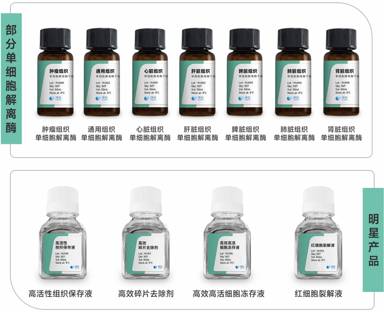 上海凈信推出了一系列針對不同組織的特異性單細胞解離酶,專為高質量單細胞懸液制備而設計。產品采用了高純度、多元化酶配方,可快速、溫和解離組織樣本,最大限度保持細胞活性和完整性,適用于各類原代細胞提取、培養(yǎng)、流式分析、類器官、腫瘤組織解離及單細胞測序等研究。